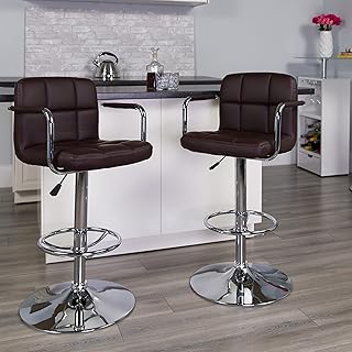 Flash Furniture Adjustable Bar Stools | Set of 2 Brown Counter Height Barstools with Back and Armrest
