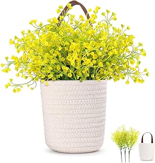 AceList コットンロープ 壁掛けバスケット 模造造花セット - 吊り下げ式編みバスケット 本革ハンドル付き 玄関 キッチン バスルーム 寝室 ホーム (フェイク植物を含む)