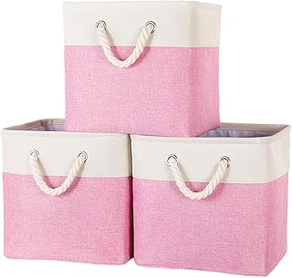 ファブリックキューブストレージビン 13 x 13 x 12.75インチ ハードボトムストレージバスケット リネンコットン & TC生地 棚 クローゼット キャビネット 保育園 ホーム オフィス 整理に - (3パック、ピンク&アイボリー)