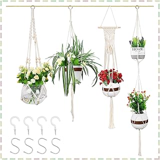 Purnap 4パック マクラメ植物ハンガー フック8個付き ハンドメイド 屋内 屋外 ハンギング プランターホルダー バスケット フラワーポットホルダー コットンロープ 庭 ホームデコレーション (脚4本 4サイズ)