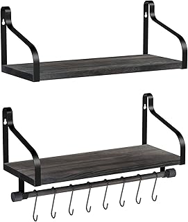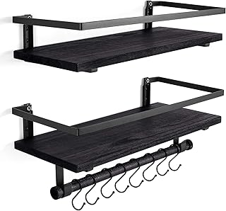 BAYKA 壁用フローティングシェルフ 木製壁掛けストレージシェルフ バスルーム キッチン 寝室用 素朴な装飾棚 取り外し可能なフック8個とタオルバー付き 2個セット ブラック