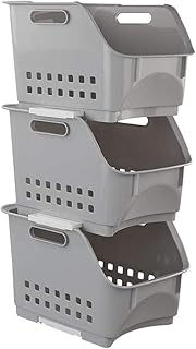 Vababa 3パック プラスチック スタッキングストレージバスケット 積み重ね可能 ビン オーガナイザー グレー