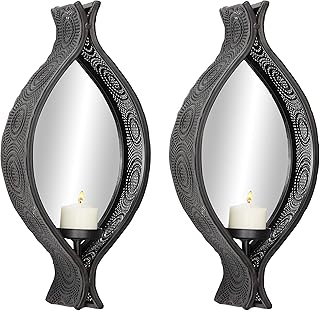 Deco 79 82901 Eclectic 楕円型ブラックメッシュメタル壁取り付け用燭台キャンドルホルダー ミラー付き 2個セット 5インチ x 12.5インチ Mサイズ